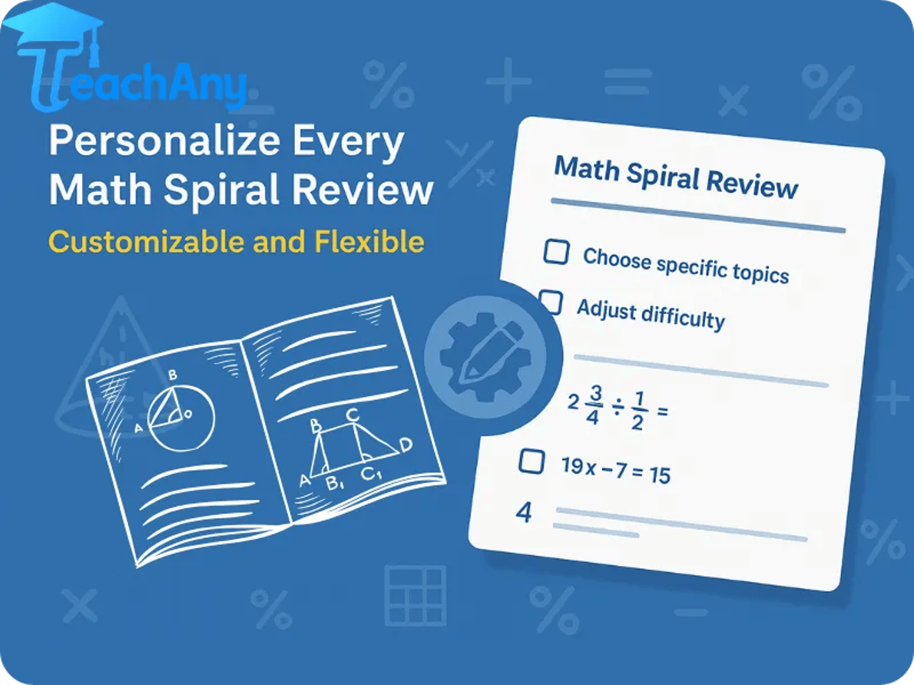 Diseña fácilmente hojas de revisión espiral de matemáticas personalizadas y cuestionarios con nuestro generador de revisión de matemáticas en línea. Genera preguntas que abarcan múltiples temas y habilidades matemáticas, adaptadas a tu currículo o a las necesidades de tus alumnos